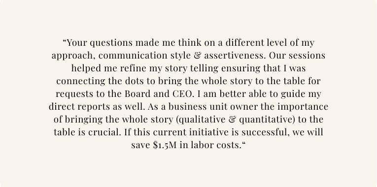 “Your questions made me think on a different level of my approach, communication style & assertiveness. Our sessions helped me refine my story telling ensuring that I was connecting the dots to bring the whole story to the table for requests to the Board and CEO. I am better able to guide my direct reports as well. As a business unit owner the importance of bringing the whole story (qualitative & quantitative) to the table is crucial. If this current initiative is successful, we will save $1.5M in labor costs.“